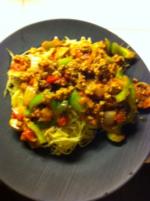 It's super easy to make and carb free! Just cut the Spaghetti Squash in half, bake for 30-40 minutes at 350 degrees, then scrape the squash with a spoon, it will look just like spaghetti. I made the meat sauce with lean ground turkey, pasta sauce, bell peppers, mushrooms, and onions.